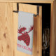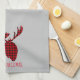 Shown in matte silver-ish colouring, this kitchen towel has a festive red and black buffalo plaid moose head on both ends and centred along with the greeting