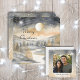 Merry Christmas Mountain River Family Photo Name Card. This beautiful midnight river features a stunning night sky over a watercolor mountain scene, with "Merry Christmas" elegantly displayed on the front. The back can be personalised with your favourite family photo, names and year, making it a unique keepsake. Its dark, starry hues and peaceful river-inspired details add a magical touch to your holiday gifting.