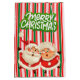A jolly Santa Claus with Mrs Claus wishing you a Merry Christmas set on a traditional red, green and white striped background.