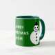 This fun festive mug would make a great gift for mum. It features a smiling white Christmas snowman with black buttons and a top hat. He looks like one cool gent and would love to help you spread the joy of Christmas this year. The background is a festive shade of green. The image is on both sides of the mug. In between is the message "Merry Christmas Mum, this text is customisable so you can turn this into a lovely personalised gift for your mum or another relation or friend. The design is shown on a green and white ringer style mug, but is also available on many more styles and colours of mug, including beautiful frosted glass mugs and convenient travel mugs to keep hot drinks warm through the winter.