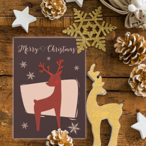 Merry Christmas card featuring a cute baby deer over a background with snowflakes and a stylised shape all in warm earth tone colours in trend for this Christmas.