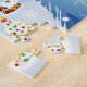 Beautiful snowscapes with Christmas trees, houses, a snowman, a church, and a rainbow with falling snow and snowflakes. Unique Santa Claus flying over a full moon on Christmas night.