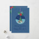 Festive blue holiday card featuring a glass ornament with a Christmas tree and presents, holly and red bow. Inside page includes a lined writing area for your message. Personalize names, greeting, and year. Perfect for family, friends, teachers, and coworkers.