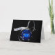 Blue ornament on black with Merry Christmas greeting on paper tag with white ribbon.