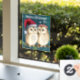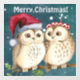This design features two cute owls (one is wearing a Santa hat) on a tree branch on a dark blue snowy background with an inscription inside.
