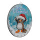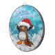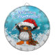 Merry Christmas Penguin Dart Board features a decorative turquoise background with snow and snowflakes, a Happy Penguin holding a colourful candy cane wearing a Santa hat. Decorative blue and white text is Merry Christmas. Perfect for Christmas Party games! Includes 6 brass darts (3 American flag dart flights and 3 UK dart flights). Regulation size board (18” diameter, 1” thick). Finished with aluminium frame and hanging hook.