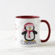 This cute mug features an adorable sledding penguin and your own personalised text. The penguin is dressed in a Holiday red and pink scarf and hat, and is coasting on a sled. A few snowflakes drift down. The image is repeated twice, with three text fields for your custom text in between. Perfect for big and little kids during the Christmas season!
