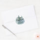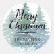 A simple, modern black and white Merry Christmas gift sticker or envelope seal with the text Merry Christmas in black chic handwritten script calligraphy on a watercolor snowy pine tree background. Simply add your family name. Exclusively designed for you by Happy Dolphin Studio. If you need any help or matching products, please contact us at happydolphinstudio@outlook.com.