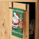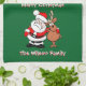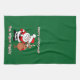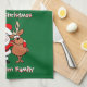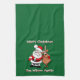 A green custom Christmas kitchen towel with Santa Claus and one of his reindeer wishing everyone Merry Christmas. The tea towel is personalised with your family name or your message.