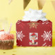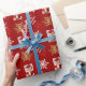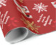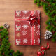 Festive personalised wrapping paper design with gold and white winter snowflakes and red ribbon bow on a deep red customisable background, personalise this design by adding your family name or text greeting and adding your favourite family photo.