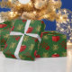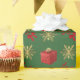 Festive personalised Christmas holiday wrapping paper design with gold winter snowflakes and red glitter Xmas present and red ribbon bow on a plain green customisable background, personalise this design by adding your family name or Xmas text greeting and adding your favourite family photo. PLEASE NOTE the gold is not metallic.