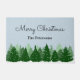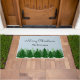 Elegant custom doormat features "Merry Christmas"  and your family name on a snowy background with pine trees. Personalize with your family's last name.