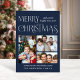 Elegant blue holiday photo greeting card featuring "Merry Christmas" in stylish vintage white typography, "happy new year" and a greeting in modern white typography, your photo and your name. Personalise your seasonal message to family and friends on the inside.