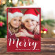 Elegant seasonal red folded holiday card featuring your photo, "Merry" in a stylish white script and your name and year. On the inside, add a personalised seasonal greeting.