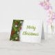 Christmas greeting card features green pine tree branches and ornaments on the left edge with Merry Christmas in matching green. Light grey and white snowflake pattern in the background on the front and inside. Customisable text in pretty black handwriting font on the inside.