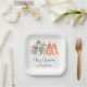 Elegant paper plates for your holiday parties and table decor featuring a watercolor abstract of pine trees in muted sage green, red, gold and terracotta, "Merry Christmas" in a stylish script and your name or event in simple modern typography.