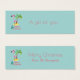 A mini business card gift tag with a cute illustration of a pink flamingo in a red santa hat standing beside a green palm tree on a mound of yellow sand. A fancy swirly christmas tree design stands beside the text. Merry Christmas written in the colour pink in a fancy handwritten font. Pastel green background. Text on the front says: A gift for you. On the back it says Merry Christmas and your personalised name.