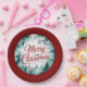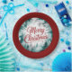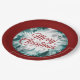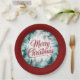 A Christmas paper plate featuring "Merry Christmas" written in scarlet with a silver and turquoise forest background.