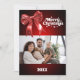 A red gradient background, white text, a red bow. Text and photo on the front. Your text and names on the back. Merry Christmas is written with a retro style font.