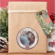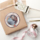 This elegant custom Christmas photo sticker label features a sample photograph in the centre which you can replace with a picture of your own family or other custom image. A sample Christmas greeting and family name are printed at the top. A circular frame features a faux red glitter border and bokeh style centre. A festive red poinsettia is placed at the bottom.