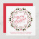This design features a merry Christmas whimsical party cute party invitation with a stylish trendy calligraphy script font, red and green typography lettering, pinecones greenery foliage leaves leaf, with botanical simple holly berry berries, a simple minimalist design pattern minimal, creative simplistic unique whimsy, stylish creative elegance elegant fun, classic fancy filigree swirly swirl, cute simple holiday party invite