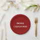 Dark Red Dessert Size Paper Plates with "Merry Christmas" in a white, snowy font.