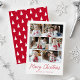 Modern holiday card featuring 6 of your photos arranged in a collage layout. "Merry Christmas" is displayed in a handwritten red script with your family name and the year shown below. The multi-photo holiday card reverses to display a red and white Christmas tree pattern.