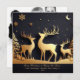 Enjoy sending out a beautiful trio of reindeers standing on hills in the forest looking at the sky with snowflakes and moon. Photo template on back and greeting text templates on front. Black background.