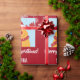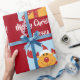 Modern, cute Christmas gift wrap for kids, with Rudolph the Reindeer, the greeting "Merry Christmas" in stylish typography, and a personalised name. On a Xmas red background with snowflakes.