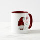 Rustic country style holiday coffee mug with "Merry Christmas" and the year in festive red & green calligraphy script. This fun design, printed on both sides of the cup, features a girl garden gnome in her red holiday hat with a gold candy cane pattern. Perfect for the holiday season.