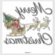 This large removable sticker has mirrored text reading "Merry Christmas" so you can put it on your windows inside and still have it readable from outside. Vintage Santa Claus illustration shows Santa in his sleigh being pulled by his reindeer. He's got presents and a Christmas tree!