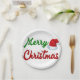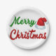 Paper plates with Merry Christmas in 3D green and red letters and a Santa Claus hat. Plates available in several sizes.