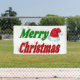 Banner with Merry Christmas in 3D green and red text and Santa's hat. Available in several sizes for indoor and outdoor.