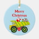 Delightful Christmas ornament: Santa, Elf, and Rudolph in a dump truck overflowing with gifts, spreading cheer with candy canes. Perfect for dump truck-loving kids. Make their holidays memorable!