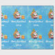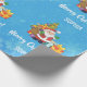 Modern Christmas gift wrap for kids, with Santa, a Christmas tree, lots of presents, the greeting "Merry Christmas" in stylish typography, and a personalised name. On a blue background with snowflakes.