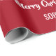 Modern Christmas gift wrap for kids, with Santa, a Christmas tree, lots of presents, the greeting "Merry Christmas" in stylish typography, and a personalised name. On a Xmas red background.