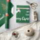 Modern, cute Christmas giftwrap with the words "Merry Christmas" in stylish typography, a personalised dedication now reading "To Amber / with love / from Santa," snowflakes, an illustration of a unicorn (with a mane and tail with red and golden glitter) pulling Santa in his sleigh, and a Xmas tree. On a green background with snowflakes.