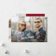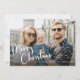 Send Season Greetings with this Modern Script Lettering Photo Christmas Holiday Card. Design features a picture of your choice with a dark overlay on the bottom with white text 'Merry Christmas, & a Happy New Year, family name and year. On the reverse you can add a second photo, cutomize the message and names. The festive red background can be changed to any colour.