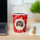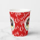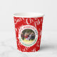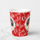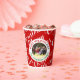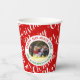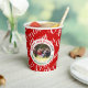 Merry Christmas script typography and photo red holiday paper cup. It showcases the text : "Merry Christmas" in script typography and a family photo in a circle on the front and the back.