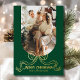 Merry Christmas Simple Modern Coquette Bow Photo Foil Holiday Card Foil Stamped Christmas Cards features a simple design with your favourite photo with the foil text overlay "Merry Christmas" in modern calligraphy script typography accented with a foil stamped bow on a green background. Personalised your names or custom text below and your custom message on the reverse. Perfect for family and friends to celebrate Christmas and the holidays. Designed by ©2025 Evco Studio www.zazzle.com/store/evcostudio