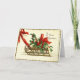 Vintage Christmas postcard with illustration of sled, ribbon and holly.