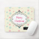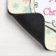 A festive mousepad set on a cream coloured background with pink and blue snowflakes. A hand drawn ornament shaped frame says Merry Christmas in a whimsical font. At the bottom right is a spot for you to personalise with a name inside a hand drawn rectangle-shaped frame.