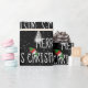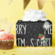 White Merry Christmas font with snowman and pine tree with hat on black background with snowflakes.