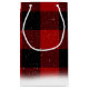 Merry Christmas white tree and gold bell ornament with snowman on red and black lumberjack plaid pattern for Christmas.