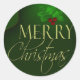Dark green background with holly berries and Merry Christmas in gold script font.