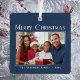 Modern Christmas tree ornaments with an elegant style. These amazing holiday ornaments offer a stylish typography greeting that reads, "Merry Christmas, Your Family Name and the Year". The custom design features your favourite photo or family picture on the front, highlighted by a unique modern gradient frame in white on a beautiful Scandinavian blue background. The back of the ornament features a text space for your custom message. Makes a fantastic keepsake gift.