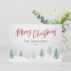 Rustic country holiday flat cards with "Merry Christmas" in a handwritten style along with your personalised family name or names and the year, all in in red & pine green vintage typography. A beautiful scenic view of trees and winter snow in watercolor style artwork highlights the front of the card. The back of the card features text space for your personal holiday message or can be left blank for you to handwrite one if needed. Available in high quality printed card stock for standard mailing or a downloadable, digital format for quick and easy sending via text message, email or even self print.