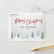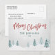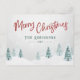 Rustic country holiday Postcards cards with "Merry Christmas" in a handwritten style along with your personalised family name or names and the year, all in red & pine green vintage typography. A beautiful scenic view of trees and winter snow in watercolor style artwork highlights the front of the card. The back of the card features text space for your personal holiday message or can be left blank for you to handwrite one if needed.