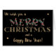 A chic but fun, text-based Christmas card, with 'We wish you a Merry Christmas and a Happy New Year' in gold-effect and tartan lettering and two gold-effect stars on a black background.