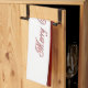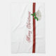 Beautiful Christmas kitchen hand towels with detailed Merry Christmas text in silver and red. A faux red ribbon with white bells and a green bow runs across the design. Very festive Christmas design for your holidays.